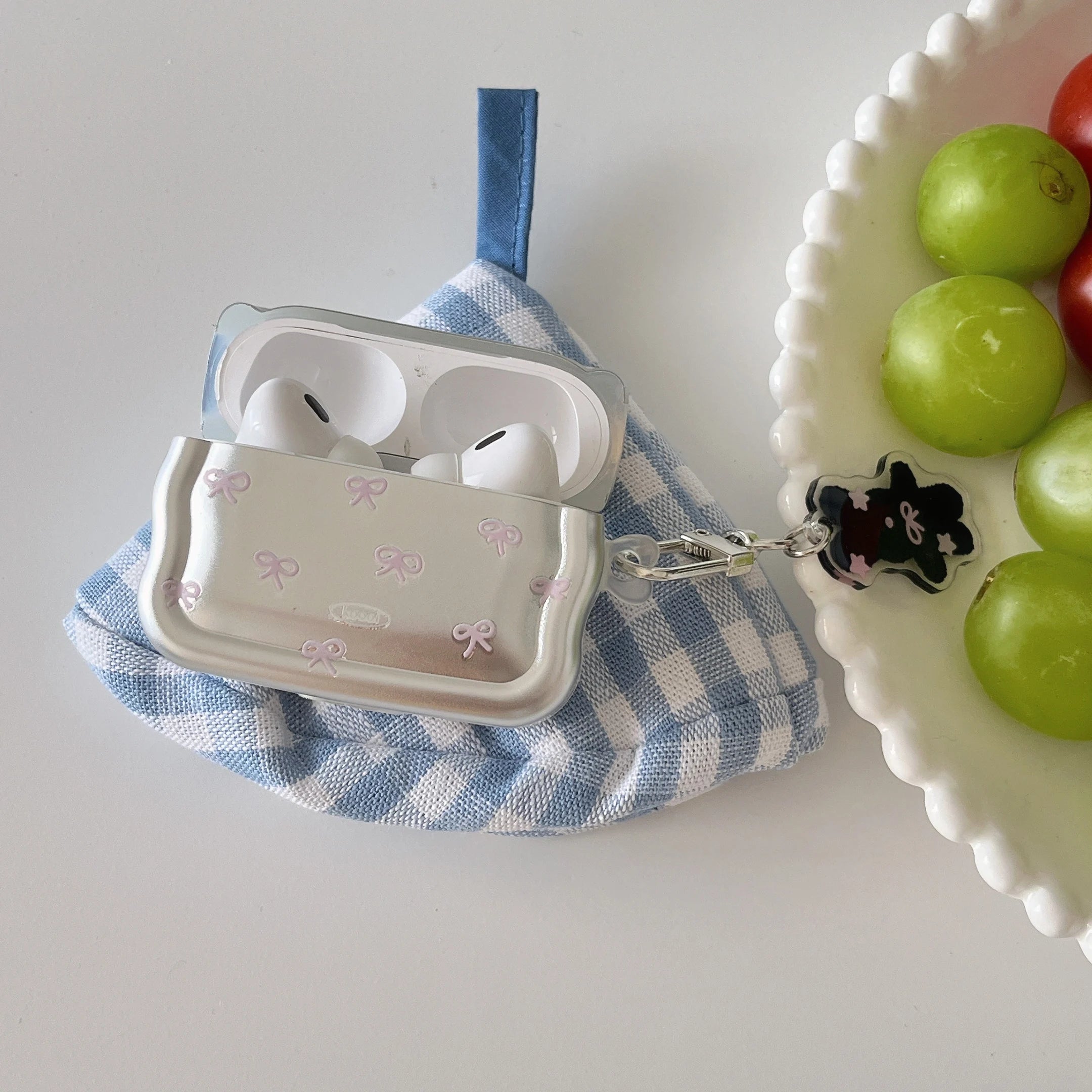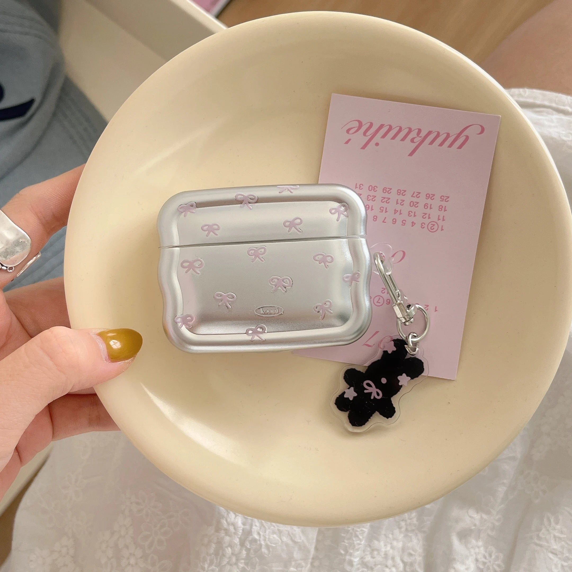 Wave Electroplated Pink Bow + Pendant Suitable for Apple for Airpodspro2 Case/For Airpodspro Case/For Airpods4 Case/For Airpods3 Case/For Airpods2 Case/Simple Earphone Case