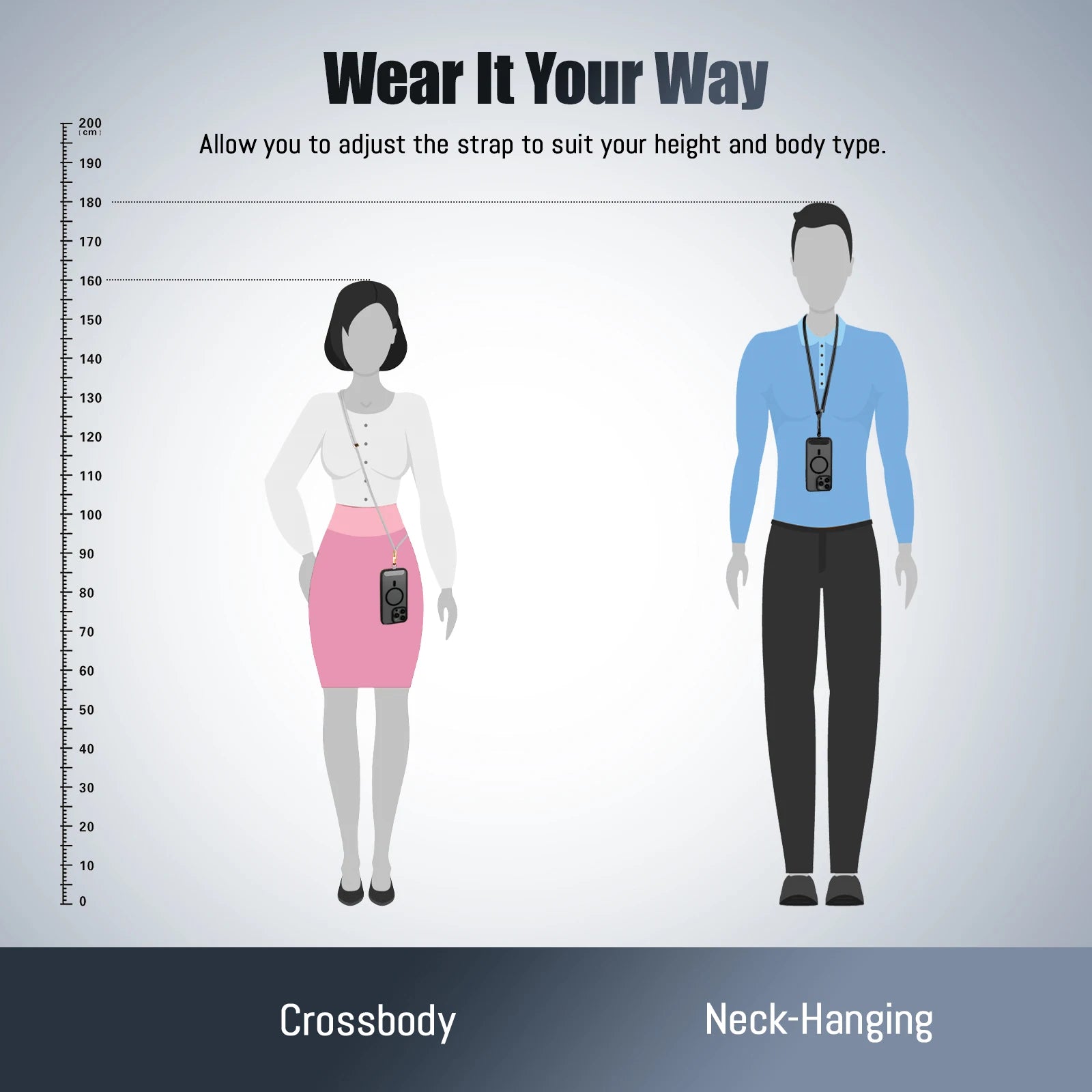 Wear It Your Way: The 59in/150cm neck strap has dual-sided adjustable sliding buckles, allowing you to adjust the length to suit your height and body type. The cell phone lanyard offers various wearing options, like wearing it across the shoulder or hanging it around the chest.
